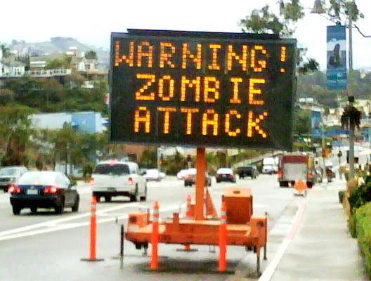 Zombie Attack signs seem to be popping up all over the world right now. Hackers have been infiltrating road signs, directing traffic in a whole new light. The last one I heard about was in Austin, Texas. Now there's one in Canada. Sounds fun!